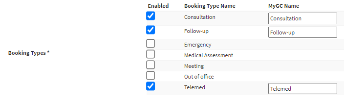 - Tick the Enabled checkbox to enable the corresponding booking type as a booking type on myGC.