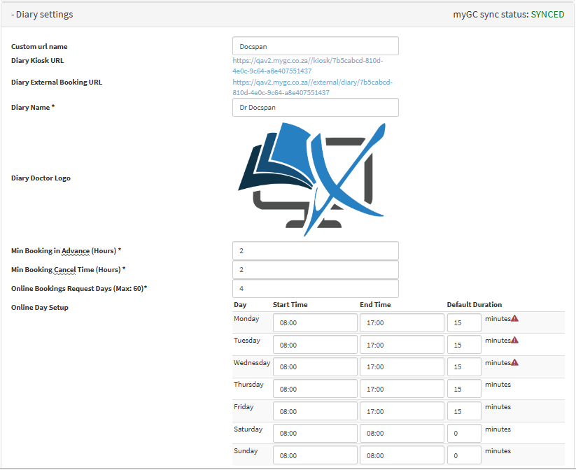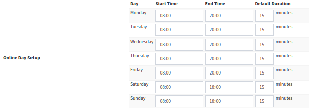 - The Online Day Setup is the Days, Start Time, End Time and Default Durations of the appointment that will be made through the myGC app.