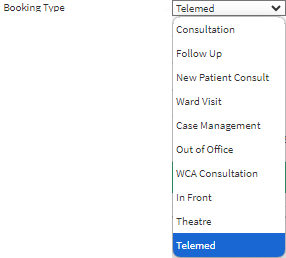 - Click on the Booking Type drop-down menu to select which booking type will be used for Telemed consultations.