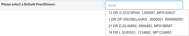 - Click on the Please Select a Default Practitioner field and start typing to search for the desired Practitioner. If multiple Practitioners are saved on the Entity, a drop-down list will appear, allowing you to select the appropriate one as the Default Practitioner.