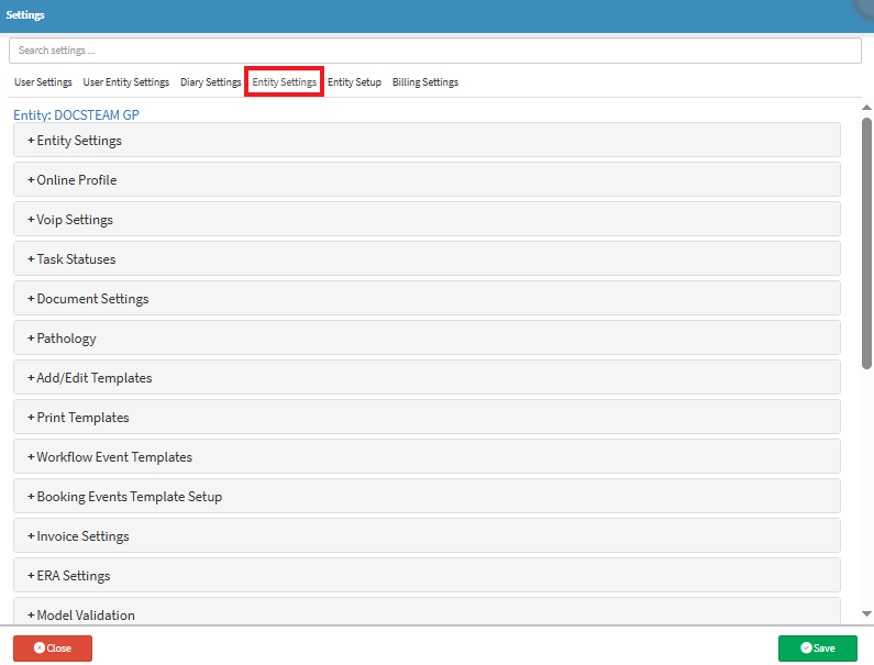 Entity Settings are set per Entity and not per user to customize the program to the specific needs of the Practice. The entity settings will determine how functions are set up and work per entity.