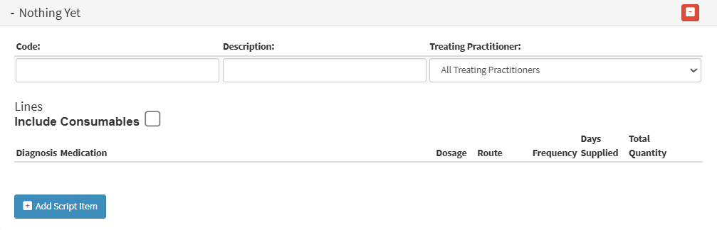 This panel allows the user to add and manage prescription script items for a Patient.