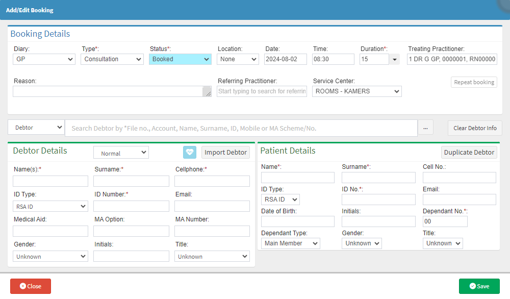 Please Note: If the Booking is for a new Patient who has not visited the Practice before, a new file will need to be created. To create a new Debtor, please refer to the user manual: Create New Debtor.