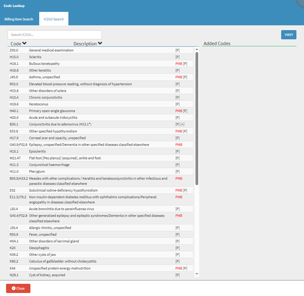 Code Lookup enables Practitioners to quickly search for and apply the correct ICD-10 diagnosis codes and billing item codes (including Procedures, Materials, Medicines, and Macros) during a Patient consultation. This functionality ensures that all medical conditions and services are accurately captured and classified according to standardised coding systems. It supports compliance with clinical and billing regulations, reduces the risk of coding errors, and improves claim accuracy. By streamlining the coding process within the system, the function enhances efficiency and assists Practitioners in maintaining complete and consistent Patient records.