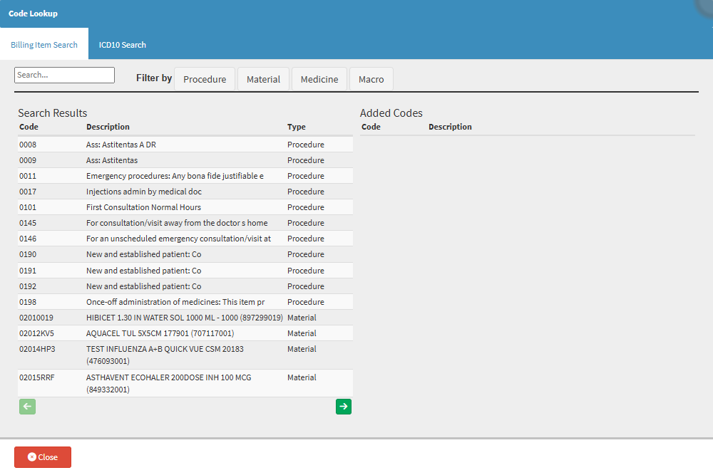 Allows you to quickly locate a specific Procedure, Material, Medicine, or Macro code by entering part of the code or description. This helps streamline code selection and reduces the time spent scrolling through long lists.