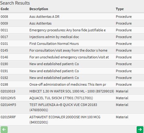 Displays all codes matching the search criteria or filter selection. This table allows for easy review and selection of the correct item for billing, reporting, or clinical documentation purposes.