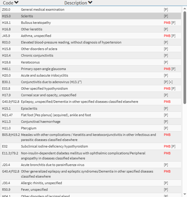 - Click on the Code arrow to sort the list alphabetically in ascending or descending order based on the ICD10 Code.