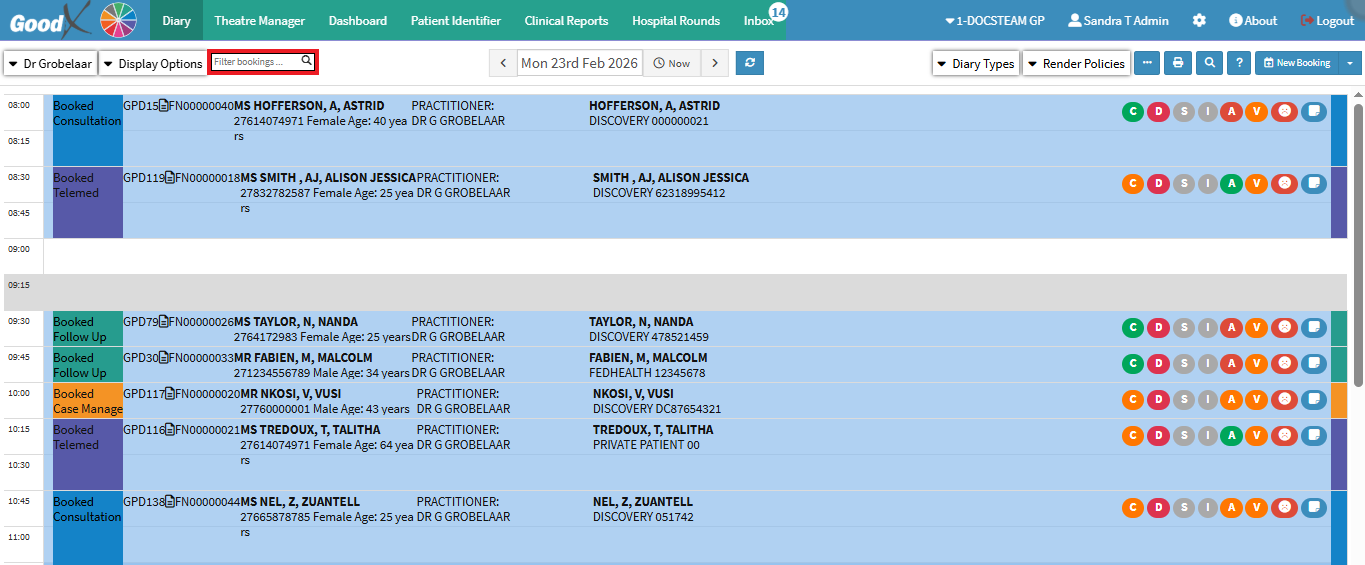 The filter assists in organising per user the diary per booking, and will indicate all the bookings that were made that were selected. This filter is per the specific day that is chosen.