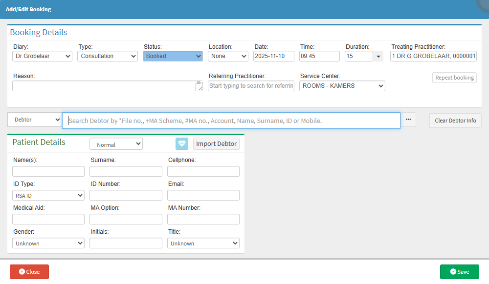 An Express Booking allows a Patient to be booked directly into the Diary while automatically creating an open and saved file on the system. No Debtor (Main Member) details are required, and there is no need to add them after the booking. The Patient Details are automatically saved as both the Debtor and the Patient on the file, providing a fast and efficient way to record appointments when full details are not yet available.