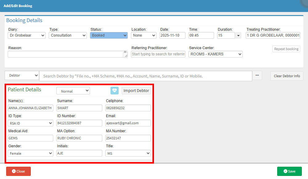 Creating an Express Booking provides a quick and efficient way to secure an appointment, particularly in urgent situations such as emergency situations. This booking type requires only the Patient’s details, as their care takes priority over capturing Debtor information. It ensures that the booking is recorded in real time while the Patient receives immediate care, with Debtor details to be completed later if necessary.