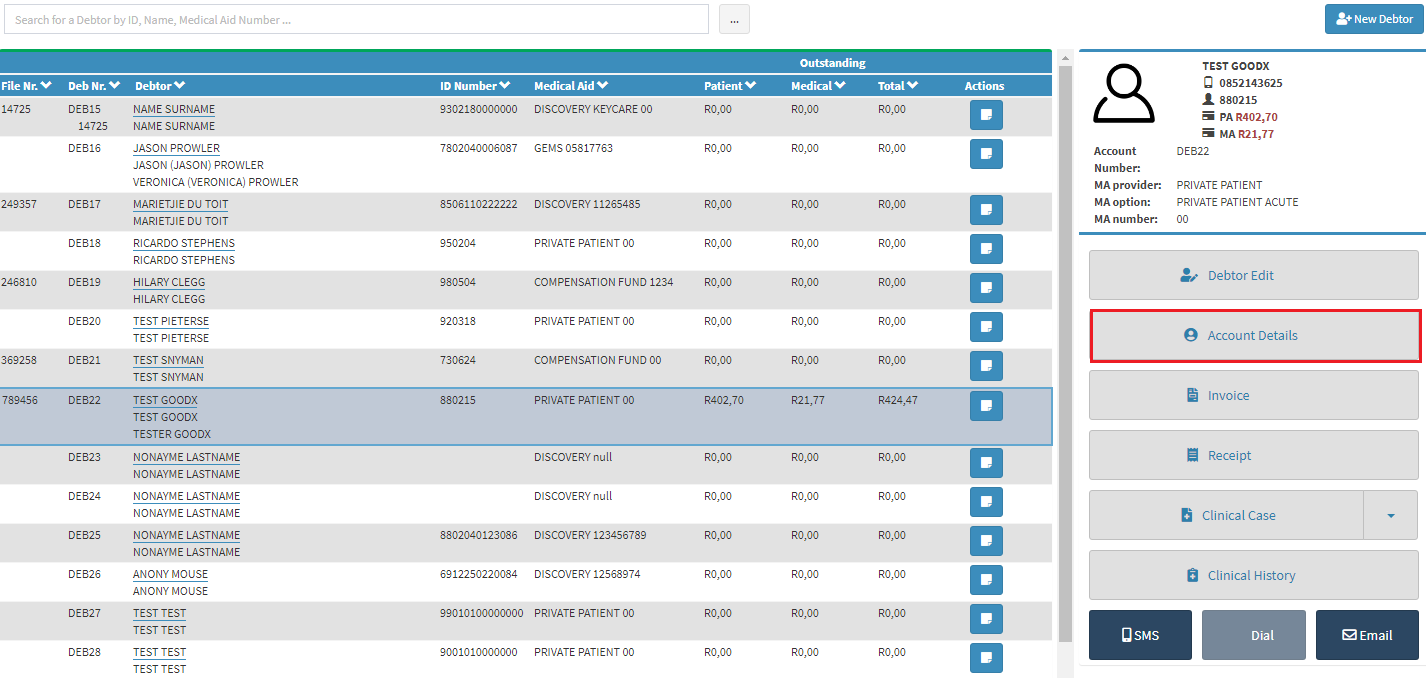 - Select the correct debtor to invoice, press Account Details