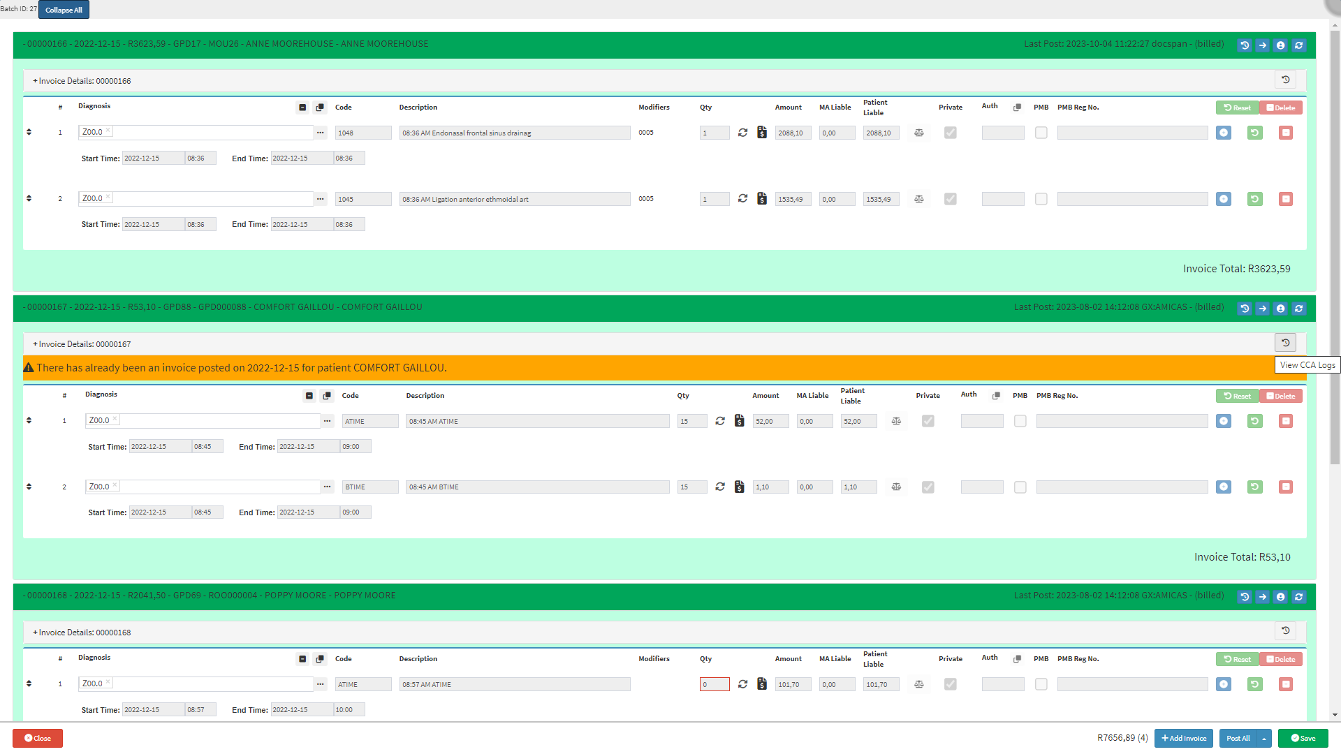 : A warning message will appear if an Invoice has already been posted on the same day for the same Patient.