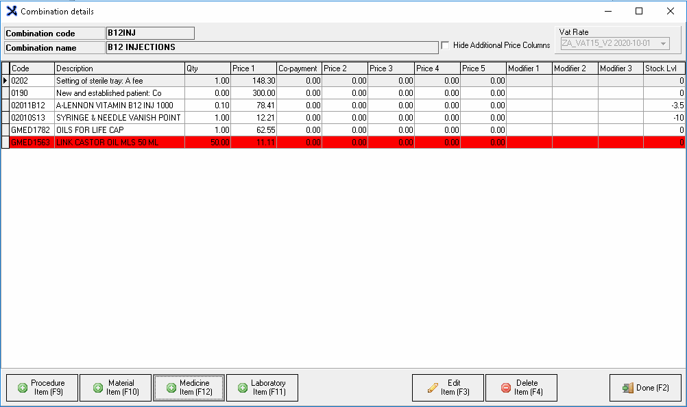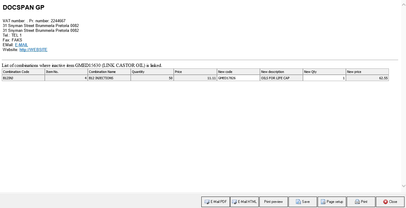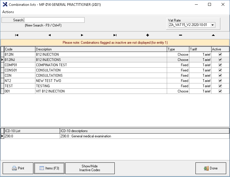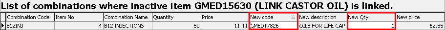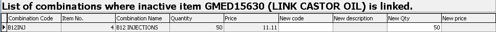 When an item is made inactive for whatever reason and it is part of a combination, the item can be replaced with a new one within the same combination by just replacing the code of the old item with a new active one. It is not necessary to re-create new combinations after an item has been made inactive. This saves time and assists with billing efficiency.