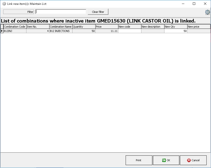 If the item is part of a combination the Link new item(s): Maintain List screen will open.