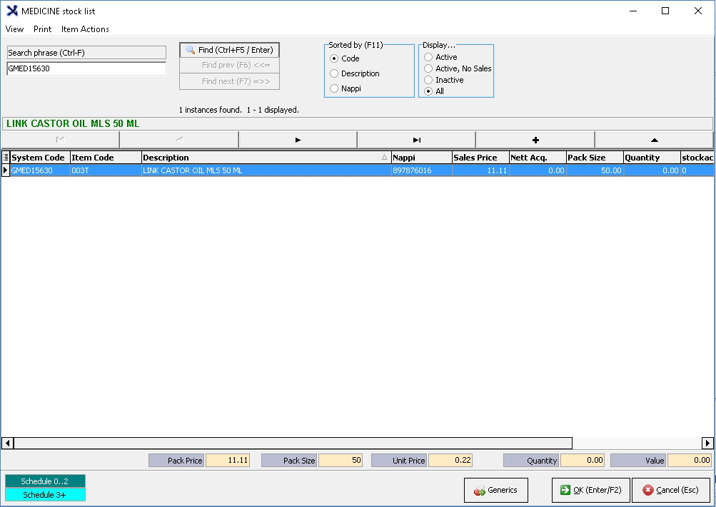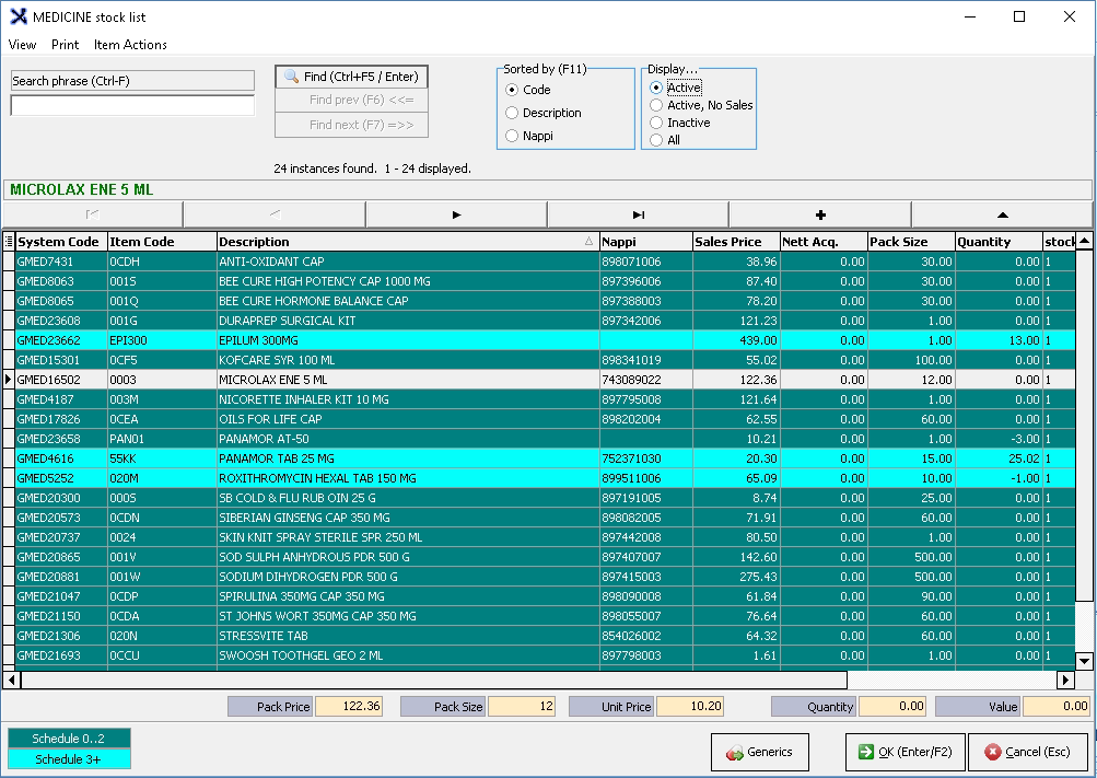 Click onOK (Enter/F2) to close the Stock List screen and return to the main MedDebs screen.