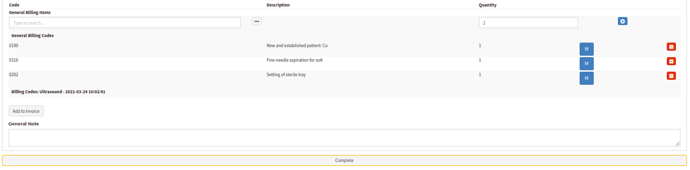 Only when the user marks the Doctor Triage and History as Completed/Finalized will the appropriate billing code (as seen below) be added automatically. The following billing code will be added in accordance with the type of Hospital visit selected: