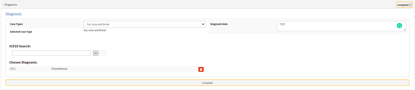 - Diagnosis: In this section, the Doctor will know and complete the diagnosis by identifying the nature of the patient's illness or other problems. He will complete the case type and case subtype and complete the ICD-10 code related to the diagnosis.