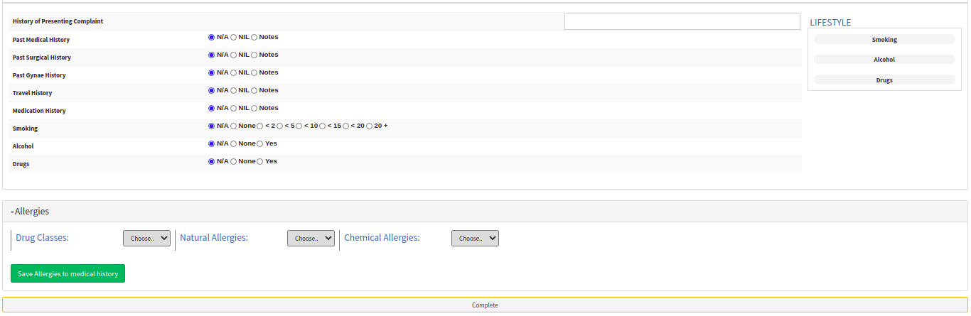- Lifestyle: the Patients lifestyle habits can be selected here for example smoking, drinking or the use of any recreational drugs.