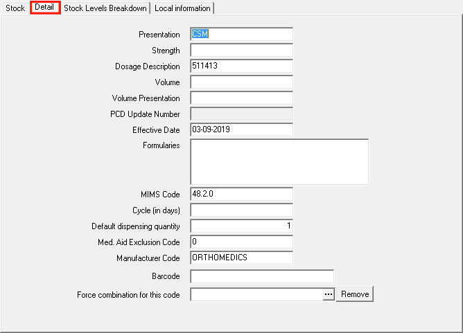 - Subclass: This allows a subclass to be added to the item. A subclass is a sub (extra level) category one can define the stock items in. For example Ampule or Sutures.
