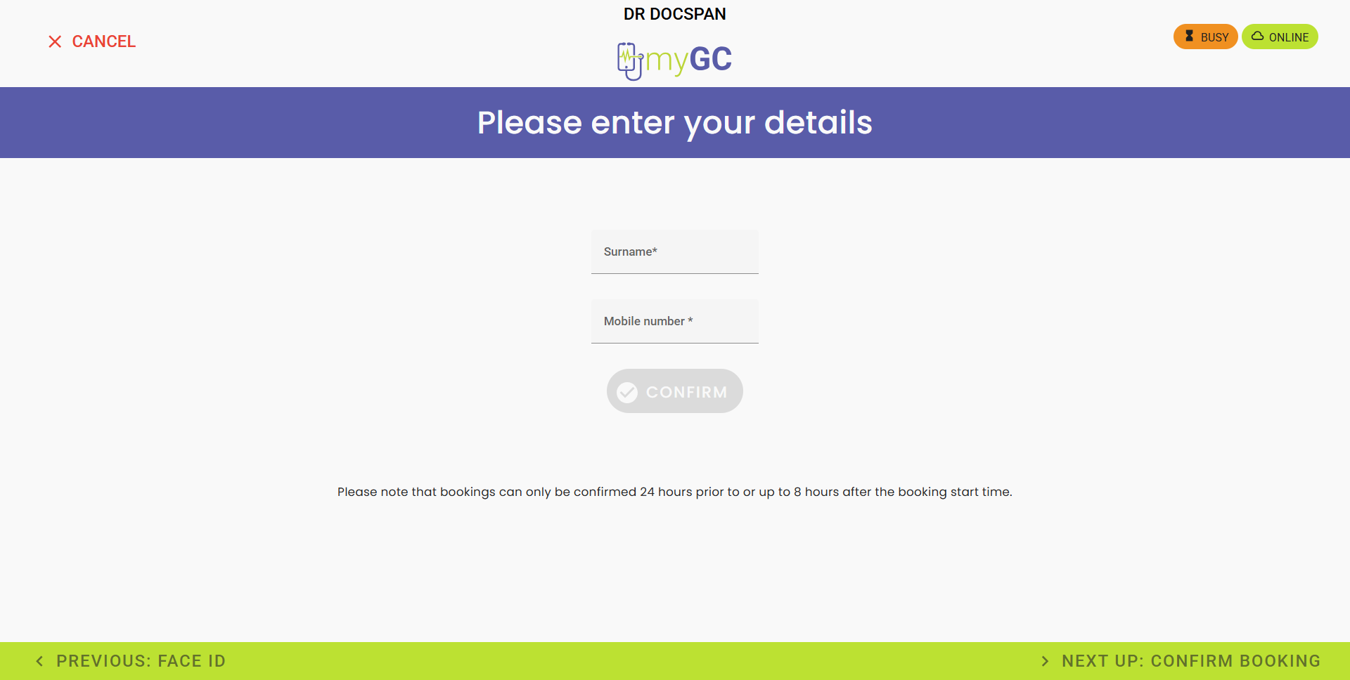 Patients can use Face ID on the Kiosk in the Practice to search for and view their booking with the Practitioner. Face ID uses facial recognition technology to match a person’s face from an image or video to a database of stored faces, verifying the Patient’s identity. It works by detecting and measuring key facial features from the image provided.