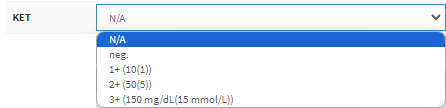 - Click on the KET drop-down menu to select the relevant result from measuring the presence of ketone bodies in the urine.