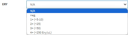 - Click on the ERY drop-down menu to select the relevant result from measuring the presence of red blood cells in the urine.