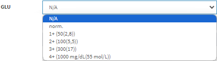 - Click on the GLU drop-down menu to select the relevant result from measuring the presence of glucose in the urine.