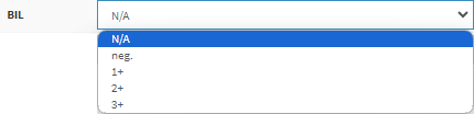 - Click on the BIL drop-down menu to select the relevant result from measuring the presence of bilirubin in the urine.