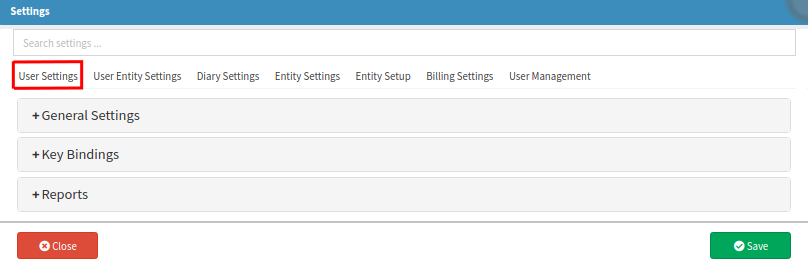 - Click on the Close button to exit the Settings screen and to return to the Diary screen.
