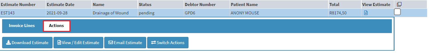 - The line will expand to display different Actions that are available for the selected Estimate.