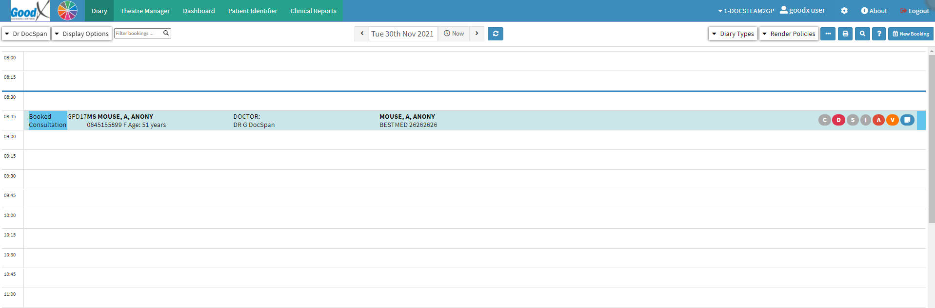 - Click on the Booking of the patient to open the Diary Sidebar of the patient for whom the Practioner would like to access the Clinical History.
