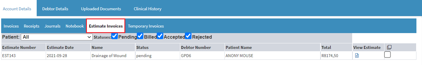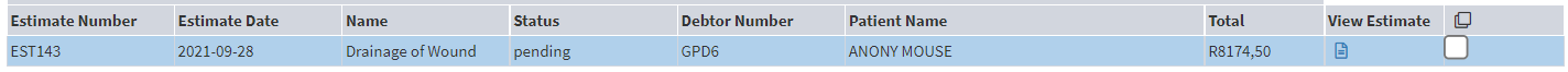 An Estimate is a quotation that is created for a patient to give them an indication of how much treatment or procedure will cost. The quotation or estimate can also be used to get authorisation from the medical aid or for private patients to have an idea of how much they will have to pay for the treatment or procedure.
