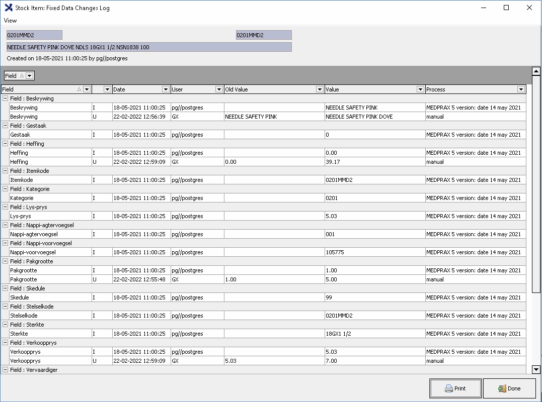 The Stock Item Data Changes Log can be used by the Practice to see if any changes were made and also see if it was a manual change or a Medprax update change.