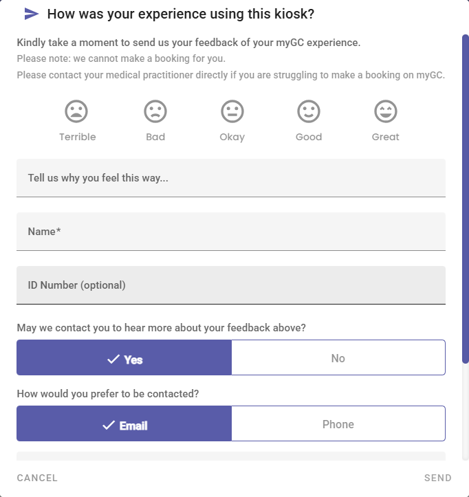 The Feedback form allows Patients to rate their experience using the myGC Kiosk by selecting from a range of satisfaction options. Patients can optionally provide written feedback, choose to be contacted for follow-up, and specify their preferred method of communication, Email or Phone.