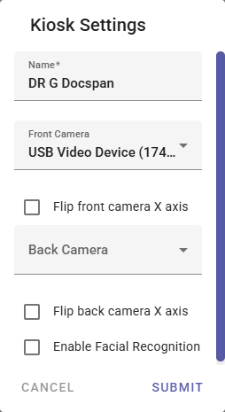 The Kiosk Settings screen allows you to configure technical aspects of the myGC Kiosk. Settings include selecting the Practitioner Name, assigning the Front and Back Cameras, flipping the camera X-axis for alignment correction, and enabling Facial Recognition if supported. Changes can be saved using the Submit button. Configuring these settings ensures that the Kiosk hardware is correctly configured for accurate Patient identification and smooth check-in experiences.