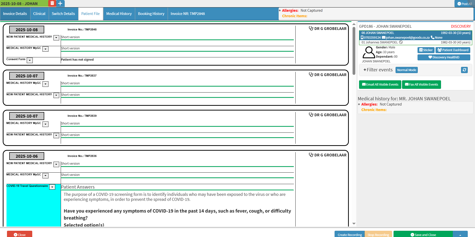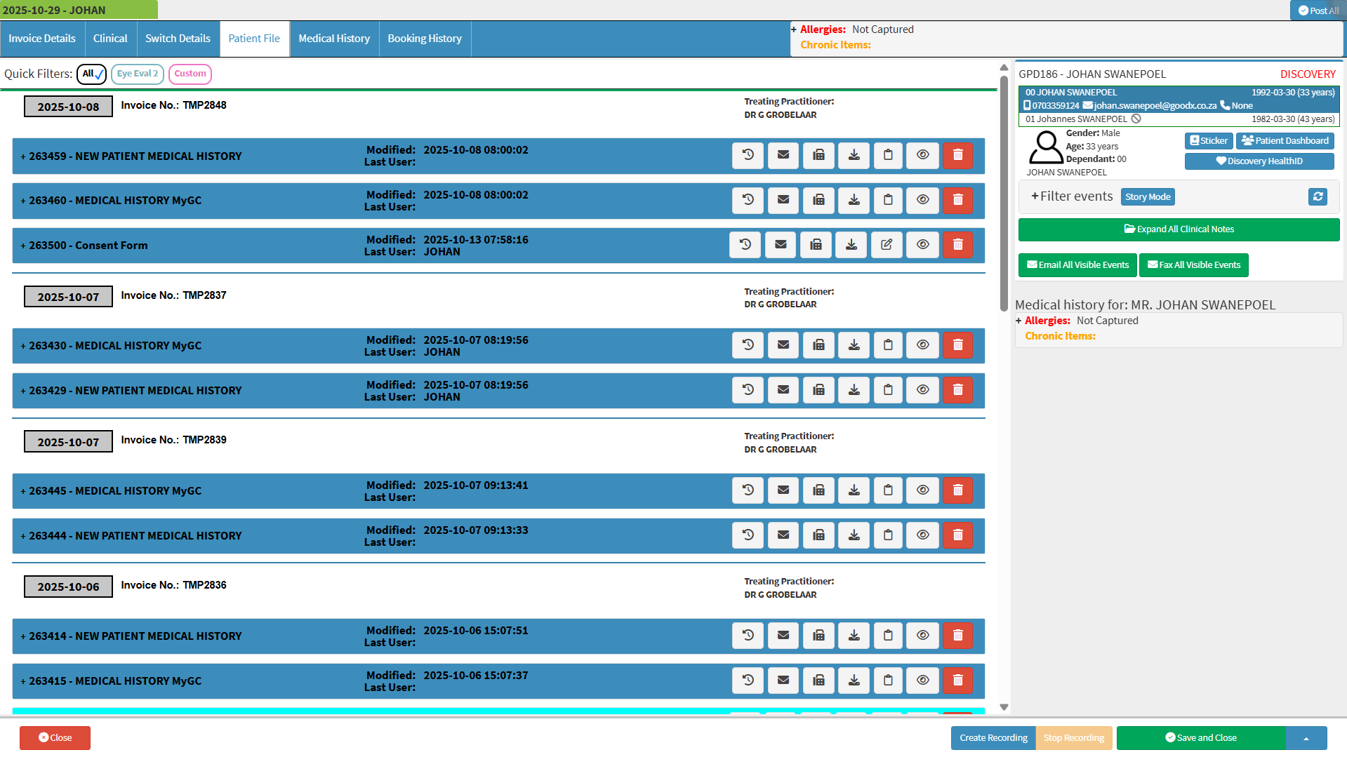 Story Mode provides a clear and intuitive view of the Patient’s Clinical History by presenting Clinical Events in a structured, narrative-like format. It organises related events chronologically and groups them by date, providing a cohesive overview of the Patient’s health journey. This layout enables Practitioners to trace the progression of care more easily, identify clinical patterns, and make well-informed decisions with greater efficiency and insight.- This user manual will start on the Patient File screen, which by default will be displayed in Normal Mode.