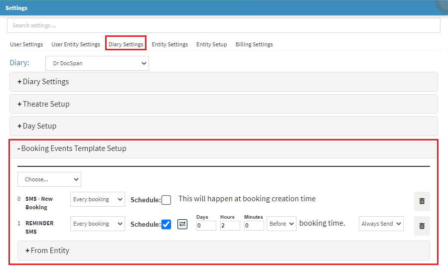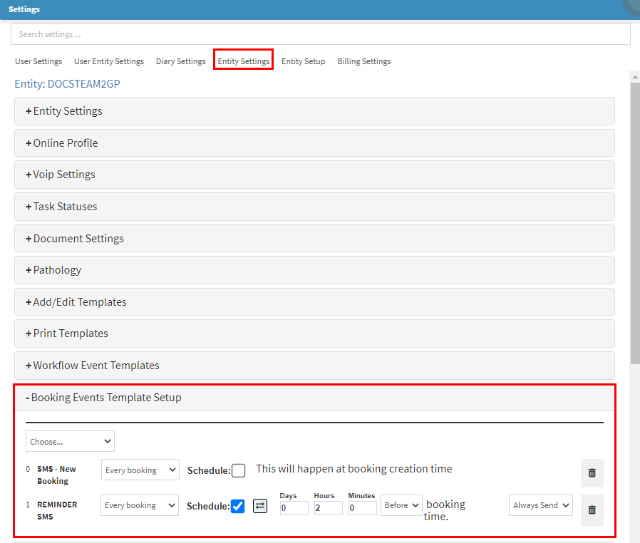 - You will set up your settings in Entity Settings. For more information on how to set up the templates, please refer to the user manual: Booking Events Template Setup (Entity Settings).