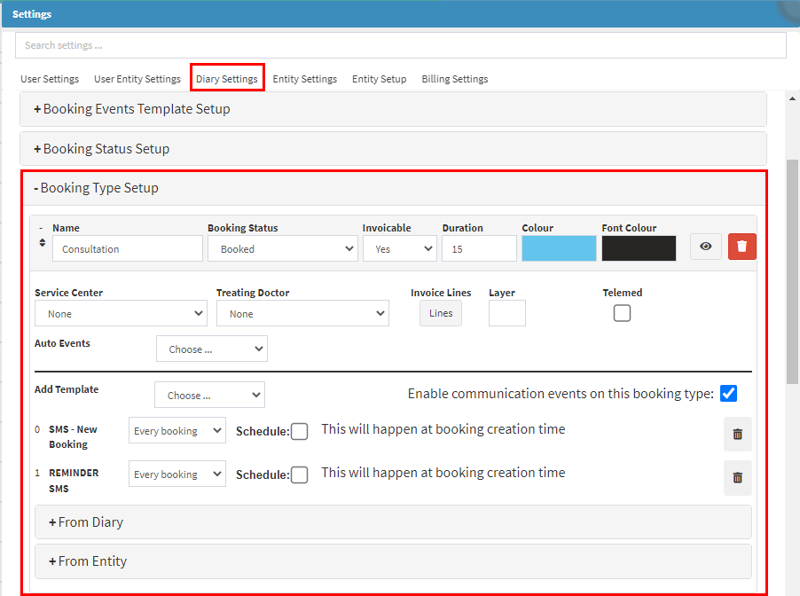 - Diary Settings - Booking Type Setup: