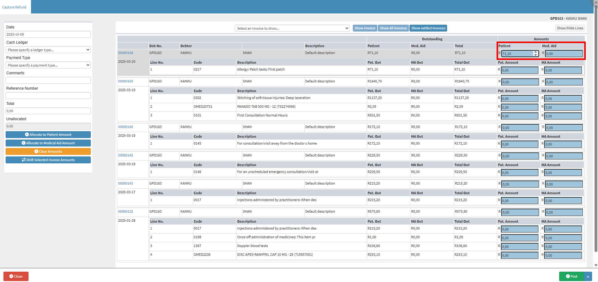 - Type in the Amounts that you would like to allocate in the relevant Pat. Amount/MA Amount fields that correspond with the Refund amount.
