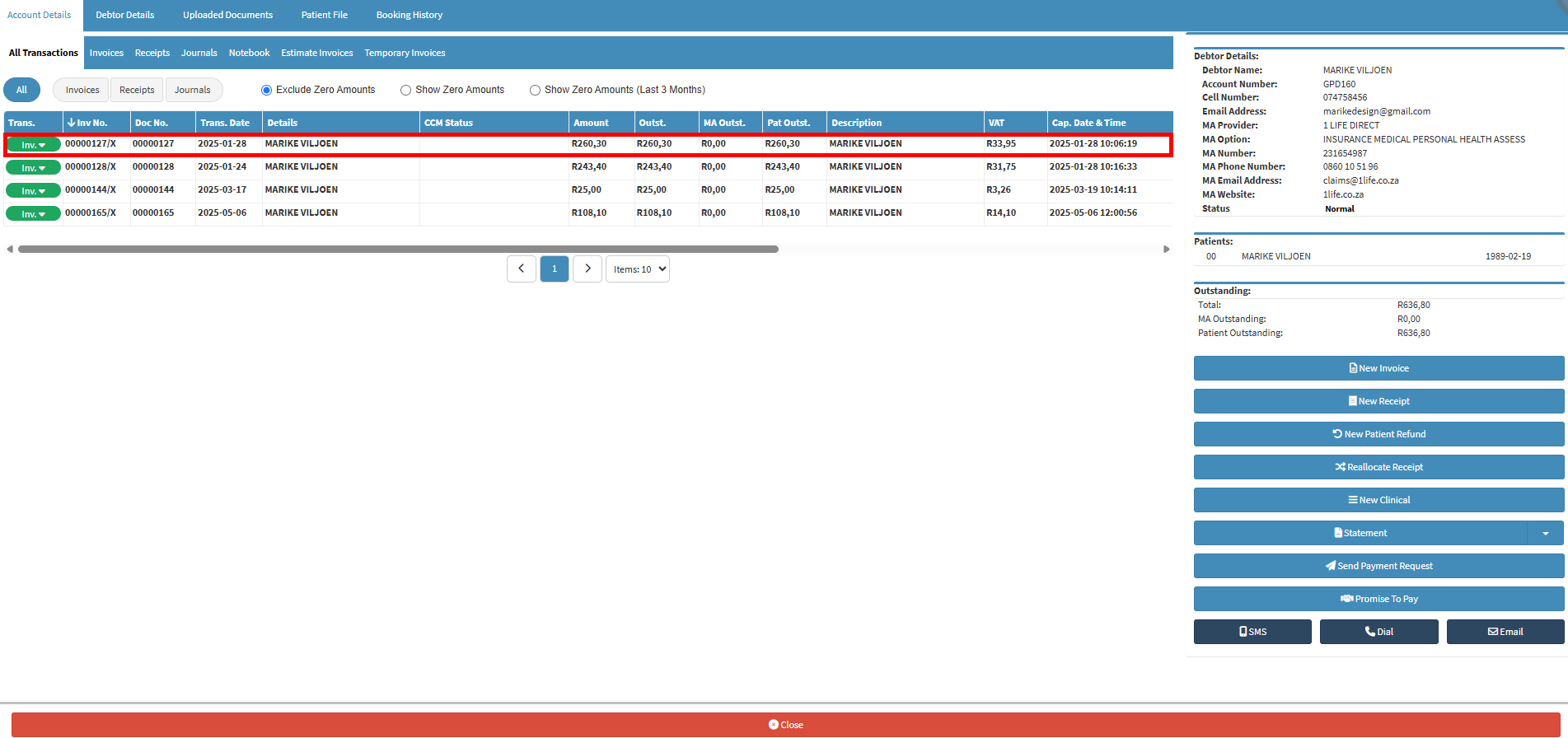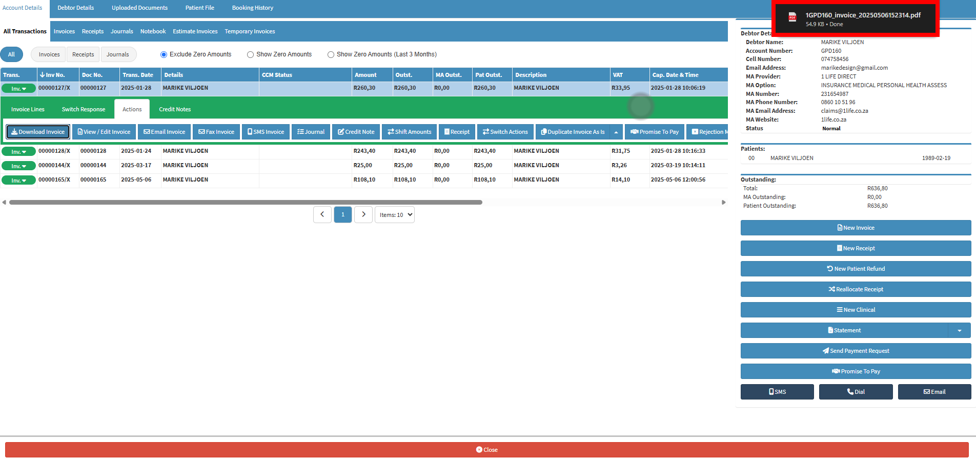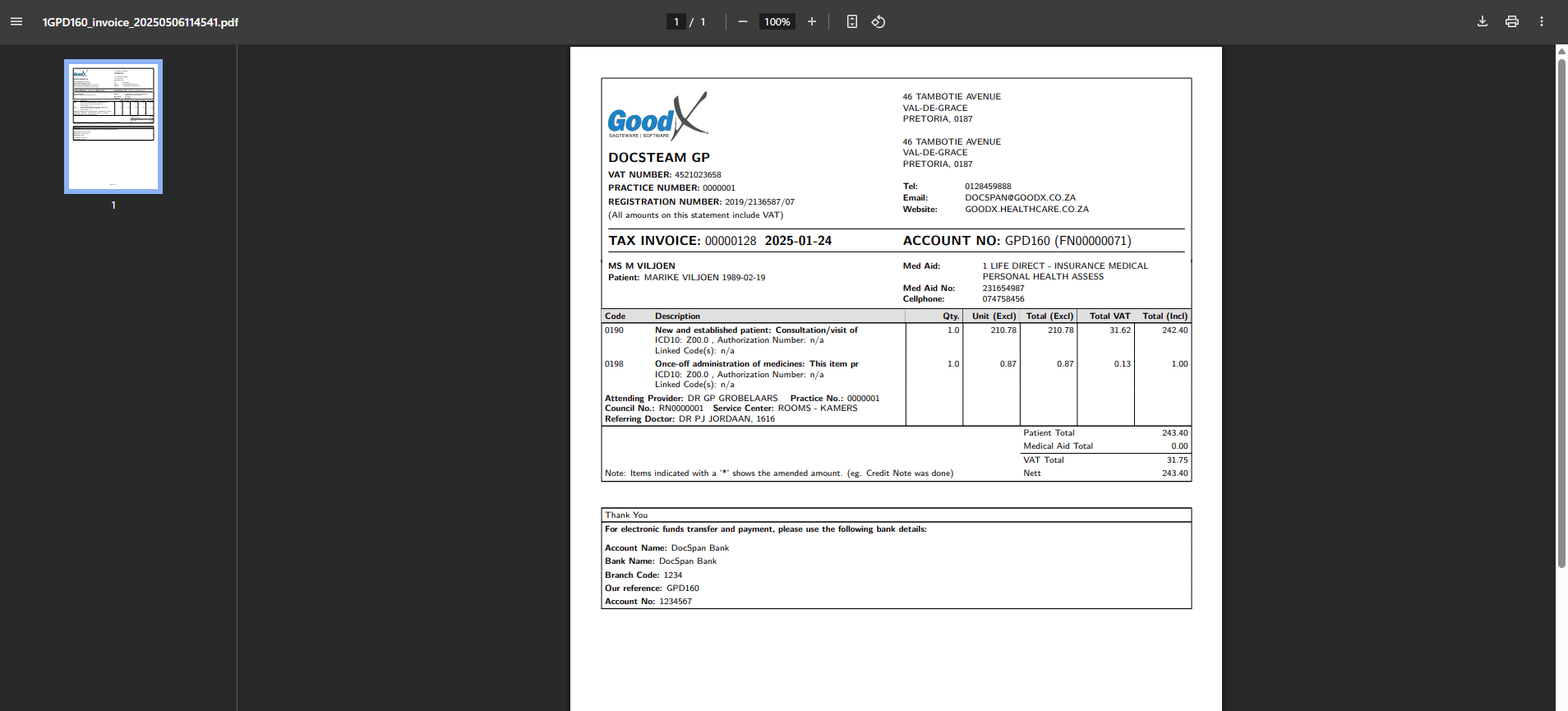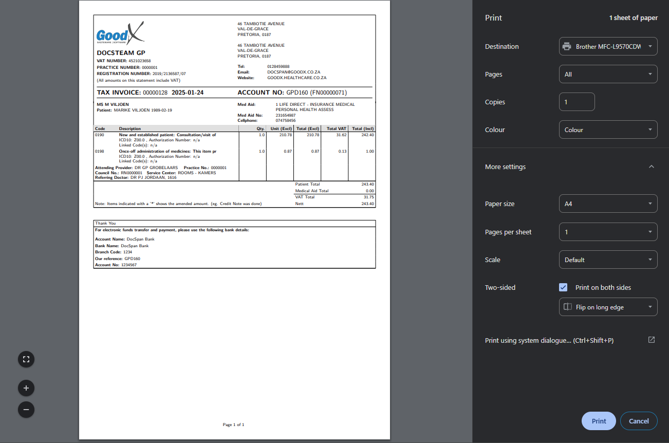 Printing an Invoice allows you to make a hard copy of the digital Invoice. An Invoice is a physical record of a transaction that shows a summary of what the Patient needs to pay the Practice. The Invoice will indicate the amount that needs to be paid for the consultation. This amount is payable either by the Patient or the Medical Aid, should the Patient belong to a Medical Aid.