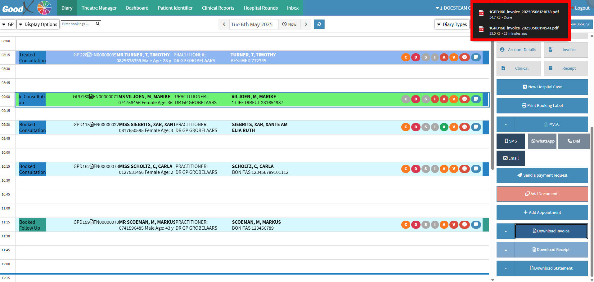 You will be able to download the corresponding Invoice from the same day's appointment.