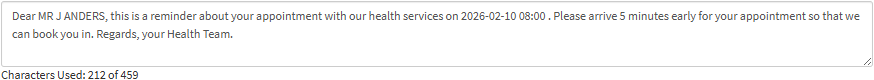 ?Please Note: The characters used in the message under the Message textbox will indicate how many characters you have left to type the SMS. The max amount of characters an SMS can consist of is 459.