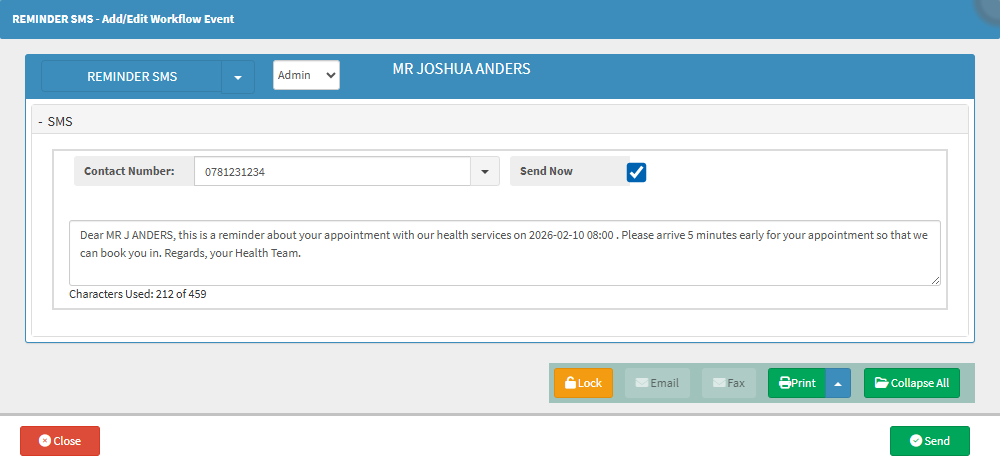 • The Reminder SMS - Add/Edit Workflow Event screen will open