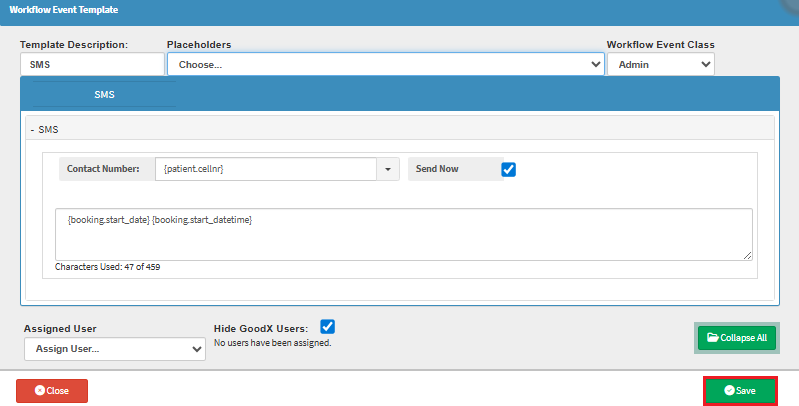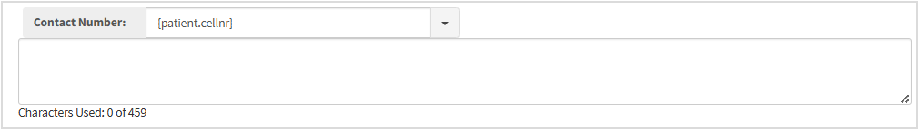 - Contact Number: A placeholder will be used here for the cell number of the Patient. The system will automatically import the patient's cell number when sending an SMS using the Template.