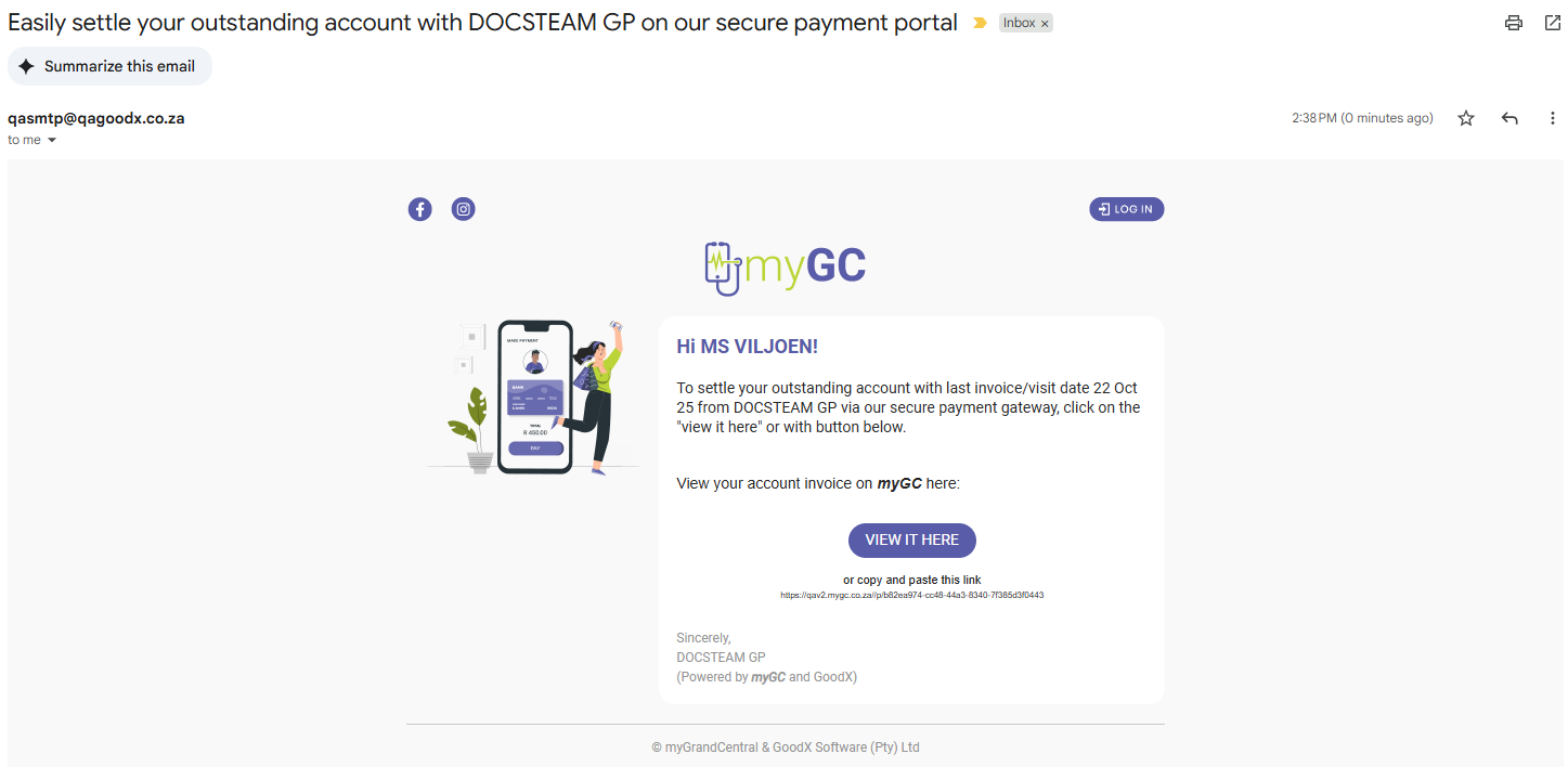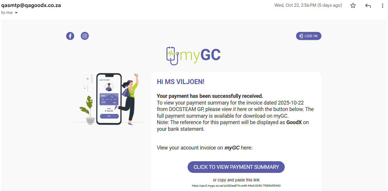 Making a payment using a Payment Request Link enables Patients and Debtors to conveniently settle accounts with the Practice. GoodX Payment Links are integrated with a secure online payment platform, accessible through the myGC Patient Portal. It also provides Patients with a simple and familiar payment experience, while helping Practices reduce outstanding accounts and streamline financial administration.