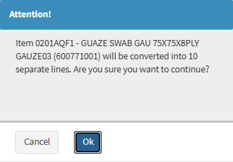 - An Attention! pop-up will open advising that the selected Item will be converted into Multiple Separate Lines.