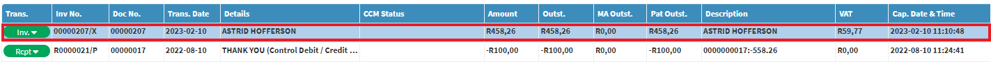 - Select the Debtor for whom you wish to view the Account Details of, in order to process a transaction on the Invoice line.