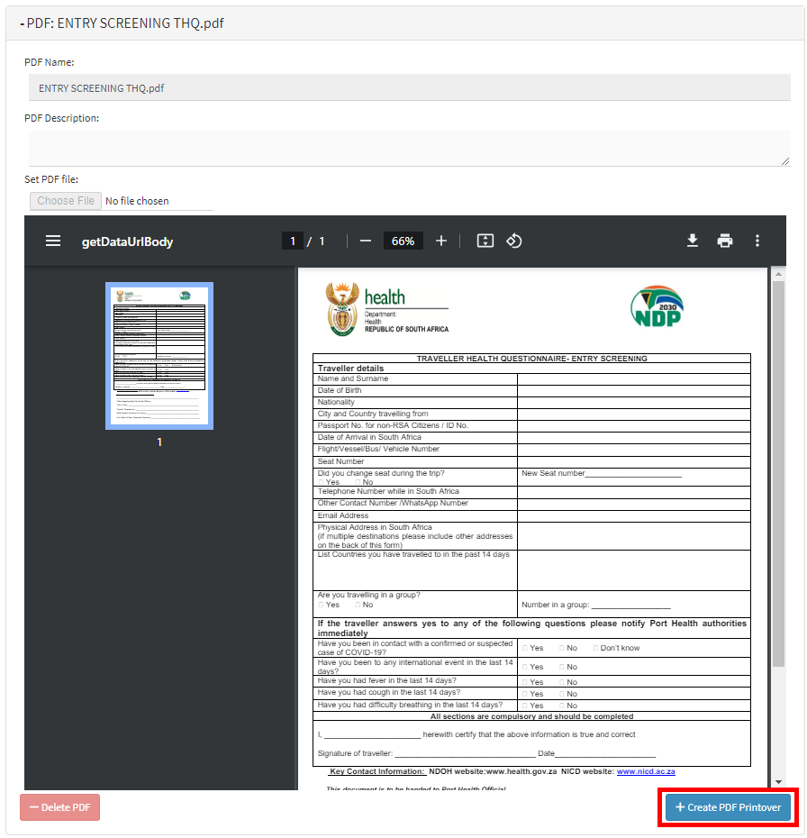 The PDF document that the Patient uploaded is used to Create a PDF Printover.- Click on the + Create PDF Printover button on the uploaded PDF.