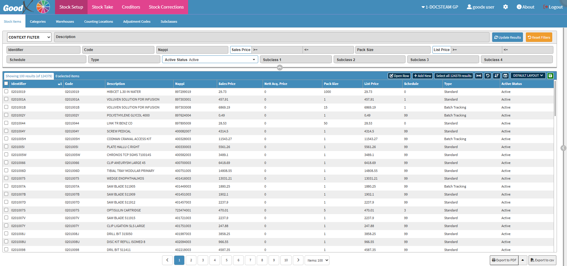 The Stock Items screen provides an overview of the Types and Quantities of Stock available within your Practice. It displays all Categories of Stock, including Medicine, Materials/Consumables, Surgicals, Ethicals and more.