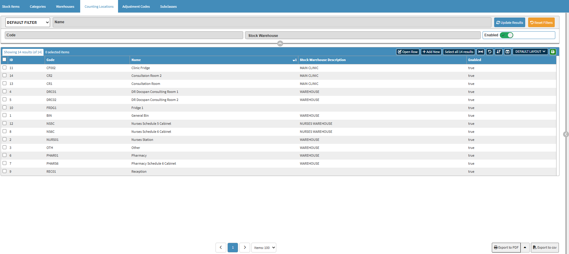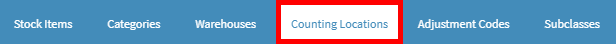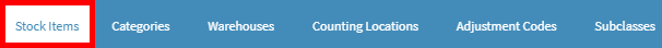 The Stock Setup screen is divided into different tabs, which consist of the Stock Items, Categories, Warehouses, Counting Locations, Adjustment Codes and Subclasses screens. Each screen has its own functions and abilities within the Stock module.